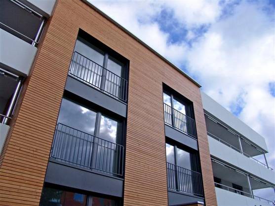 Fassadendetail der Lärchen-Romboidschalung, behandelt gegen Verwitterung und UV-Einstrahlung. Fensterzargen und Blenden aus Aluminium, pulverbeschichtet.